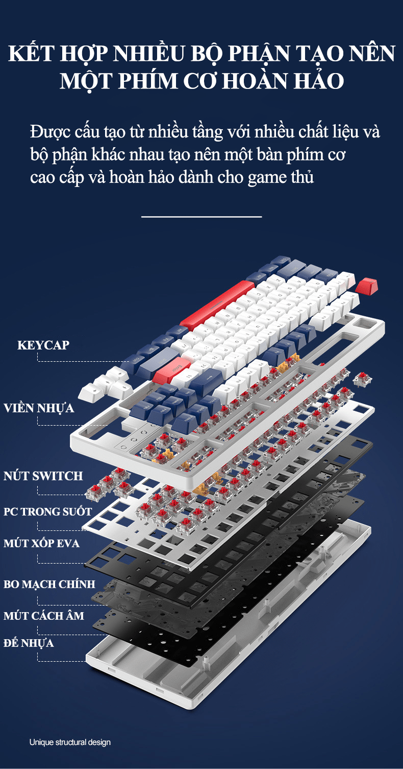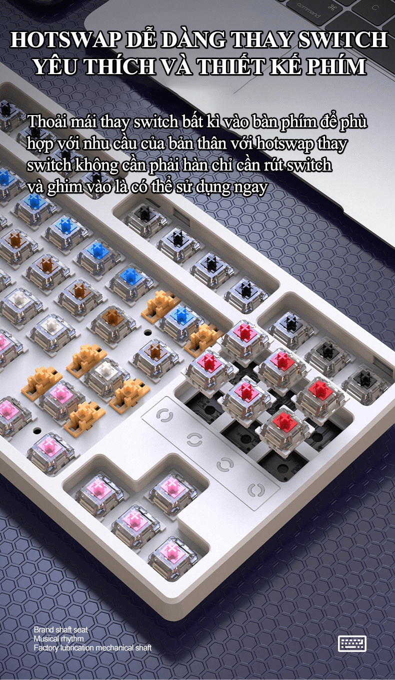 • Keycap tháo lắp dễ dàng thuận tiện cho việc vệ sinh và custom phím